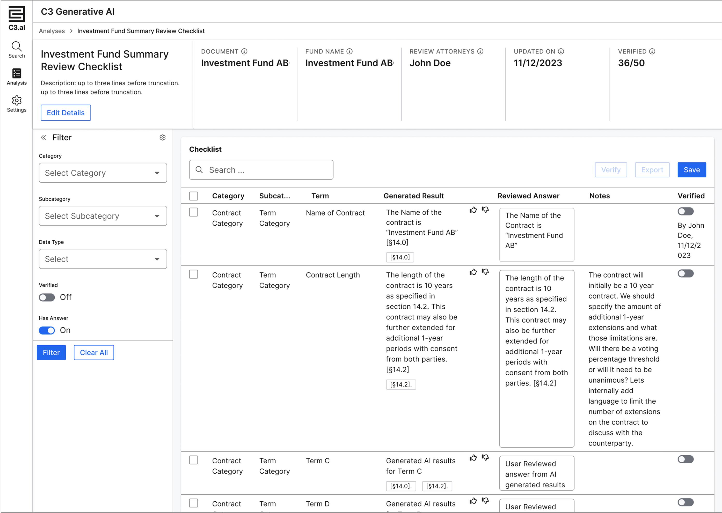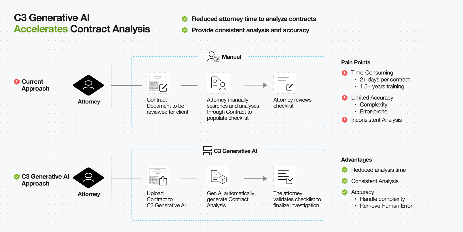 Contract analysis is transformed by C3 Generative AI by automating key workflows to ensure attorneys can efficiently review contracts while maintaining consistency and traceability.