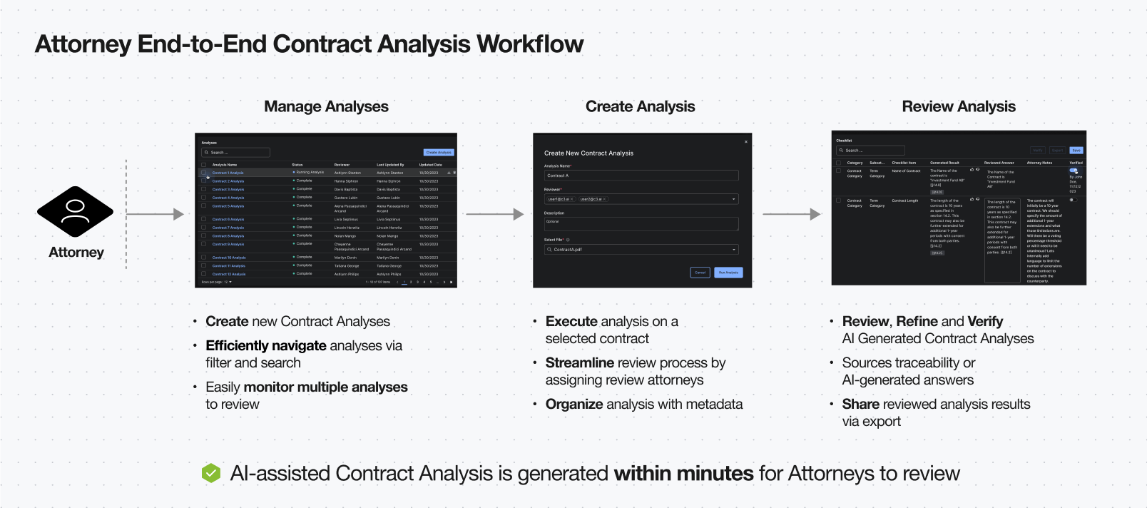 Figure 3: Contract Analysis Workflow enables attorneys to efficiently manage, create, and review contract analyses, delivering insights within minutes