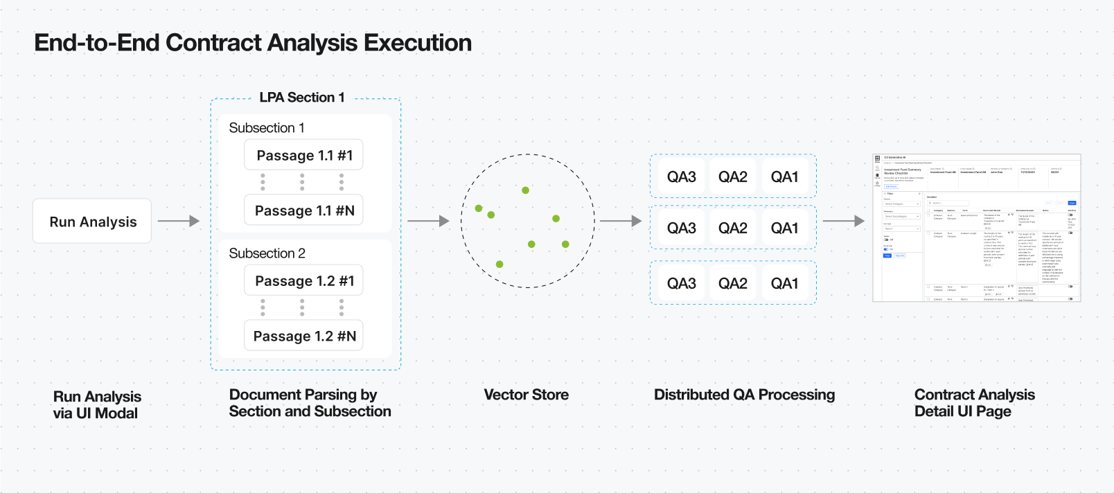 Legal contract analysis requires context awareness across multiple analysis points. To achieve this, the system utilized a distributed question-answer (QA) processing approach to preserve dependencies between related analysis points and enables parallelized architecture that: