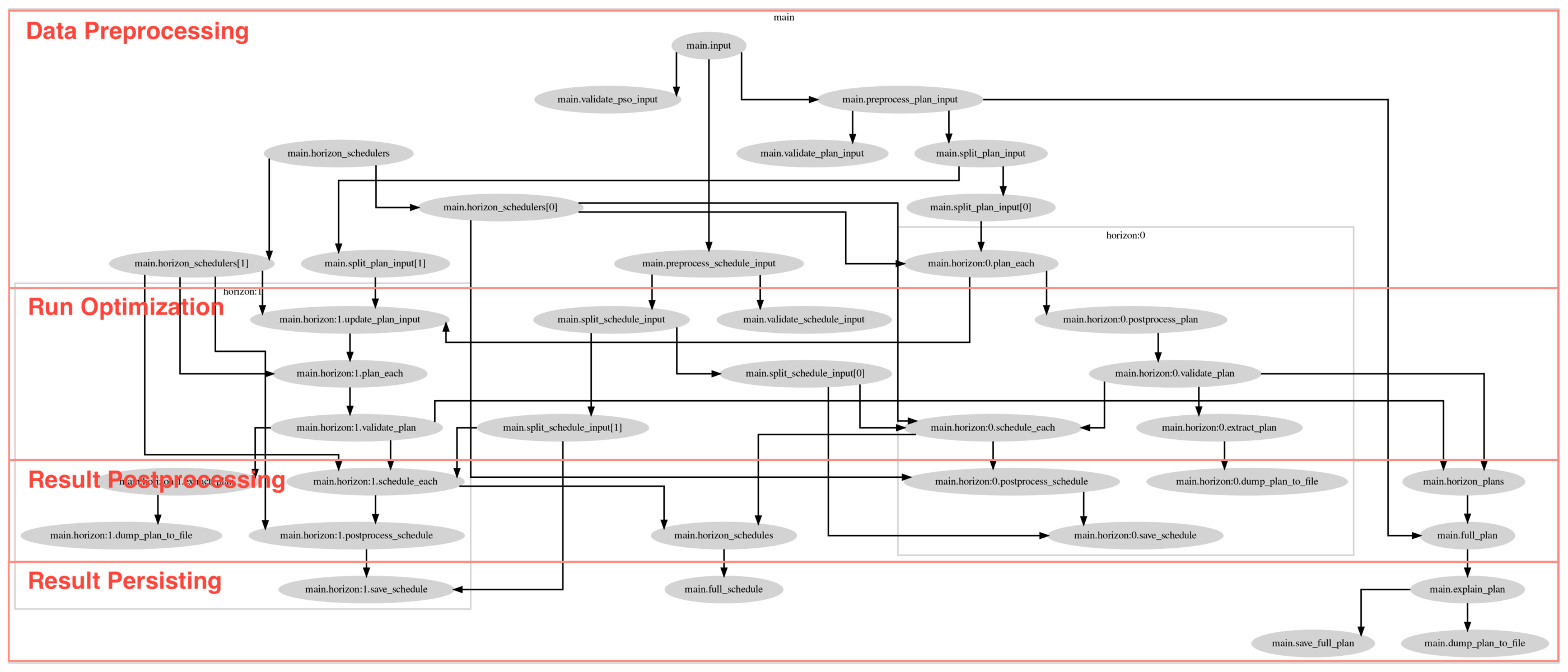 Considering a real-life use case for a productionized OR solution in supply chain management. The process begins with data collection from multiple sources, followed by validation and cleaning. Next, the optimization model created with OptimFormulation is solved in multiple stages, breaking the problem into smaller instances over the time horizon. Finally, the results are concatenated and post-processed. OptimFlow streamlines this entire process, allowing developers to focus on improving the optimization model rather than managing workflow intricacies. Figure 2 below visualizes a complex optimization workflow using OptimFlow, showcasing multiple stages and dependencies required for a comprehensive solution