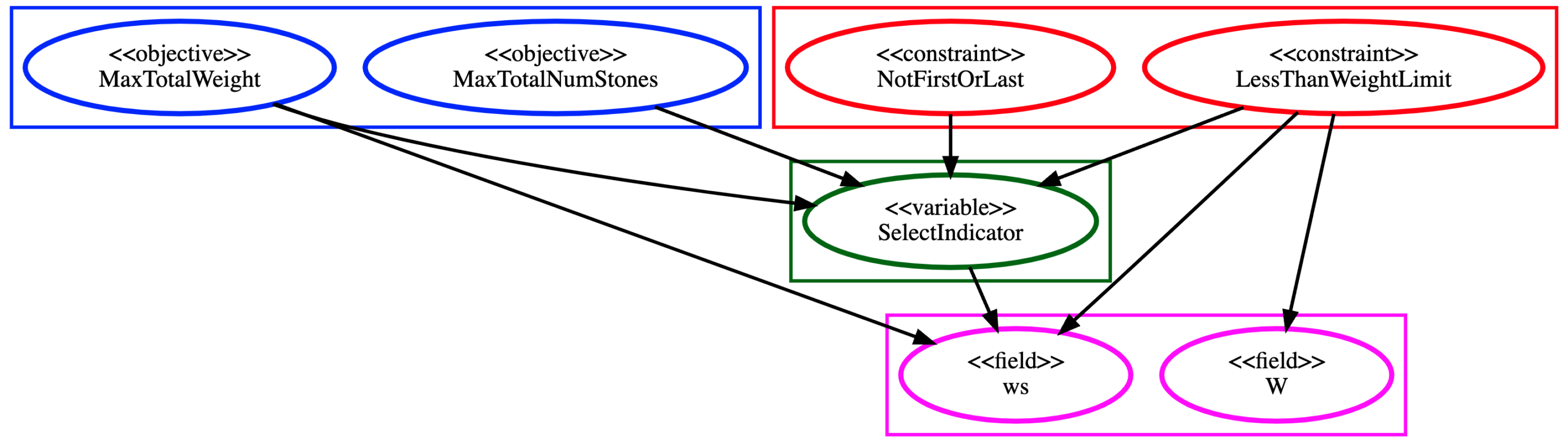Figure 3. An example of a dependency graph created withOptimFormulation. - Full lifecycle tracking: This feature offers a single point of entry for the developer, which reduces the maintenance and book-keeping efforts needed. The Solution object in the