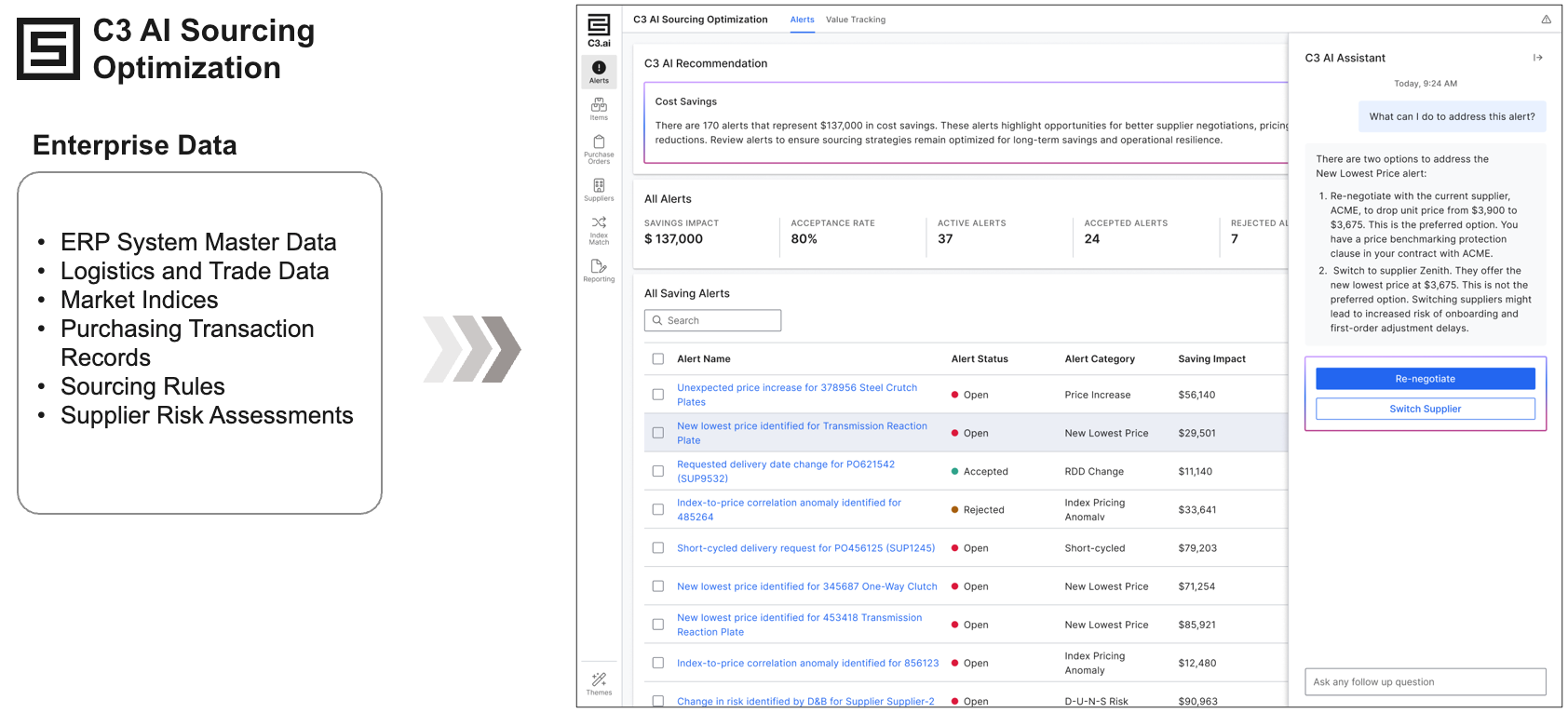Through the partnership with C3 AI, Baker Hughes successfully transformed fragmented manual processes into an automated, high-confidence decision system. Opportunities are presented with a full evidence package – total landed cost breakdowns, similar part rationale, and index-based pricing signals. The user feedback loop created a system that enables users to train future recommendations with “internal knowledge” by accepting or rejecting opportunities and connecting live market indices to SKUs. Buyers can monitor markets in real time through live tariff feeds to immediately estimate the total landed cost of an order as new executive orders are announced.
