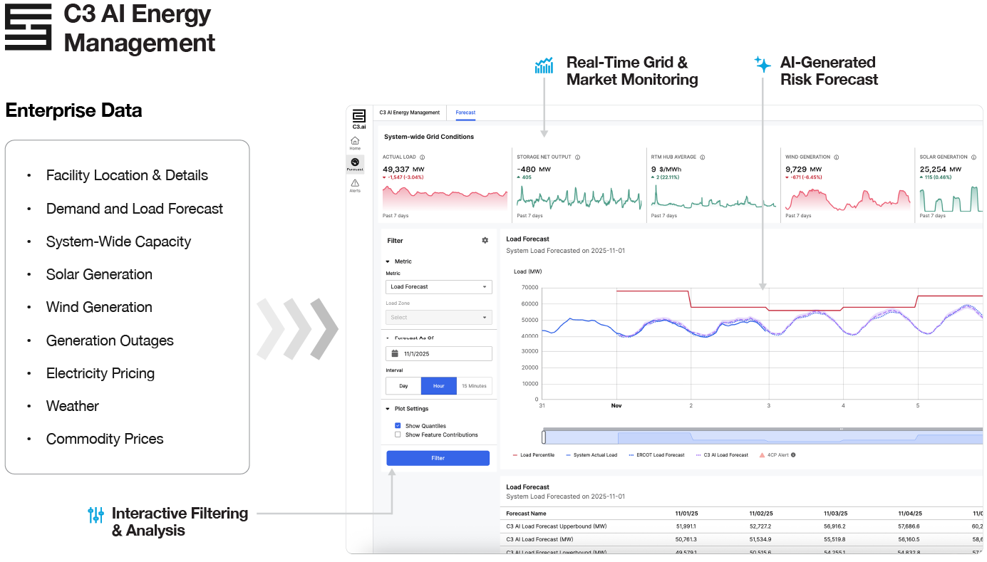 C3 AI Energy Management empowers energy managers to monitor conditions in real time, coordinate across sites, and take timely curtailment or load-shifting actions, unlocking up to $1.4M in additional annualized savings for the manufacturer. The C3 AI solution also achieved 100% recall of 4CP events, capturing peak events missed by the internal model. Given the initial success, the manufacturer is scaling the solution beyond ERCOT, beginning with PJM Interconnection, followed by Midcontinent Independent System Operator (MISO) and New York Independent System Operator (NYISO), as part of its multi-region energy optimization strategy.