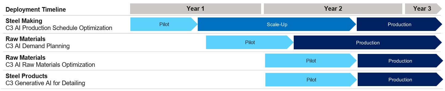 Before implementing C3 AI applications—including C3 AI Demand Planning, C3 AI Raw Materials Optimization, C3 AI Production Schedule Optimization, and C3 Generative AI for Detailing—the company faced increasing pressure to optimize supply chain performance and enhance decision-making across its value chain. The raw materials unit struggled with short forecasting horizons, price volatility, and manual data consolidation, leading to increased inventory costs and supply chain risks. In the steel making unit, production scheduling was managed manually through spreadsheets, taking up to five days and limiting responsiveness to demand changes, resulting in lower yield, excess inventory, and frequent production delays. Meanwhile, the steel products unit relied on labor-intensive detailing processes that required up to 200 hours per job, resulting in delays, errors, and increased labor costs. These challenges, driven by fragmented data and manual workflows, hindered agility and responsiveness across the operations.