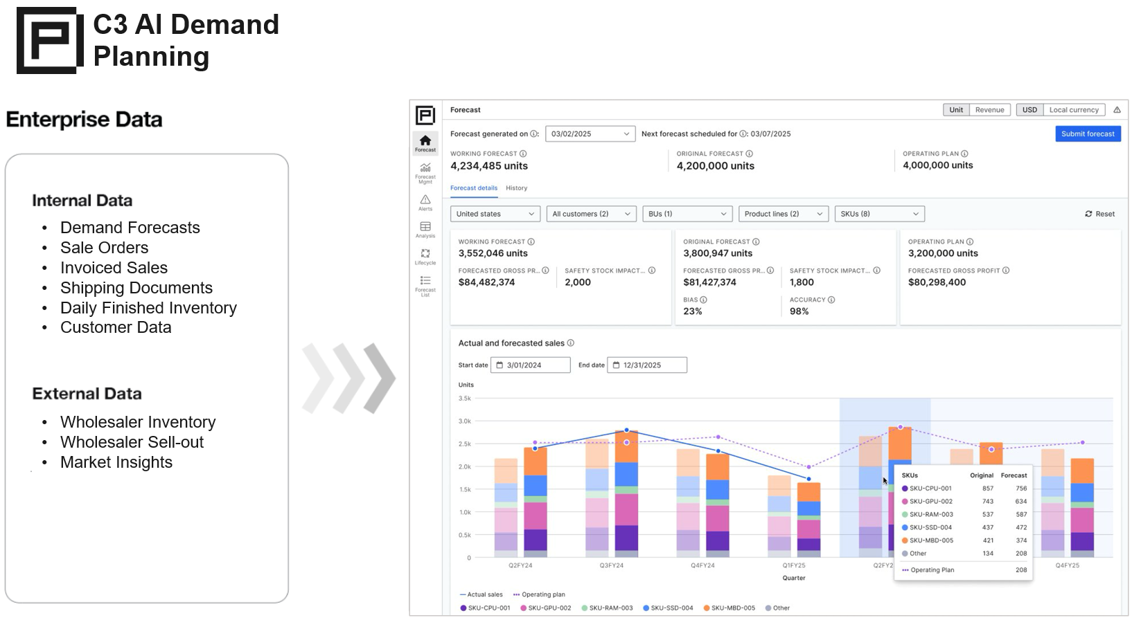 With C3 AI Demand Planning, the firm improved its forecast accuracy by 20% compared to the baseline statistical forecasts. The AI forecast accuracy was also 4% higher than the adjusted forecasts performed by dozens of subject matter experts (SME). This accuracy uplift directly translates to $20 million potential inventory reduction annually for the three markets.