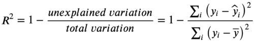Where 𝑦𝑖 is a dependent variable, 𝑦̂𝑖 is the output of the regression model, both indexed by 𝑖, and ӯ is the mean of the dependent variable. 𝑅² is always less than or equal to 1; the larger it is, the more the variance of the dependent variable is explained by the regression model.