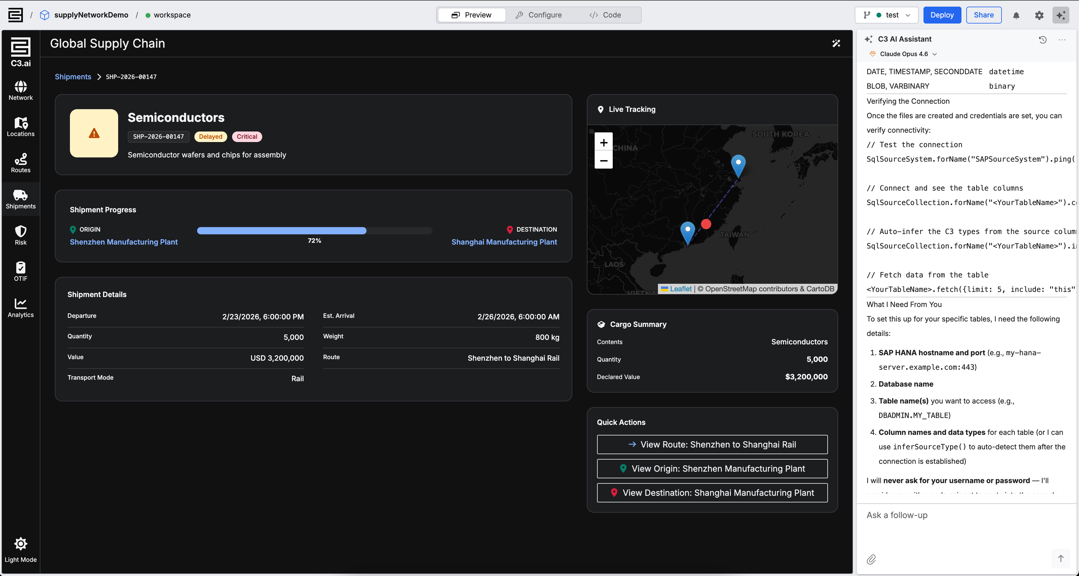 Shortage severity scoring pipeline configured via C3 AI ML modules — ranking every facility and SKU by criticality.